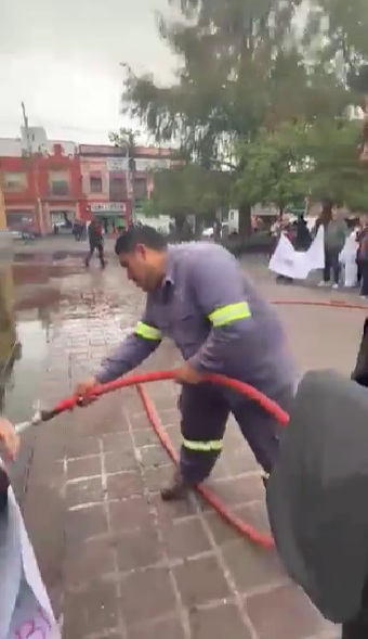 De acuerdo con el video que circula en redes sociales, se aprecia que, mientras un grupo de personas se manifestaba, un trabajador se acerca con una manguera con agua con la cual lavaba la plancha del Jardín Hidalgo y, después de cruzar unas palabras con los manifestantes, una persona de mochila negra le arrebata la manguera al empleado y por ello se salpica con agua a las personas que estaban en protesta.