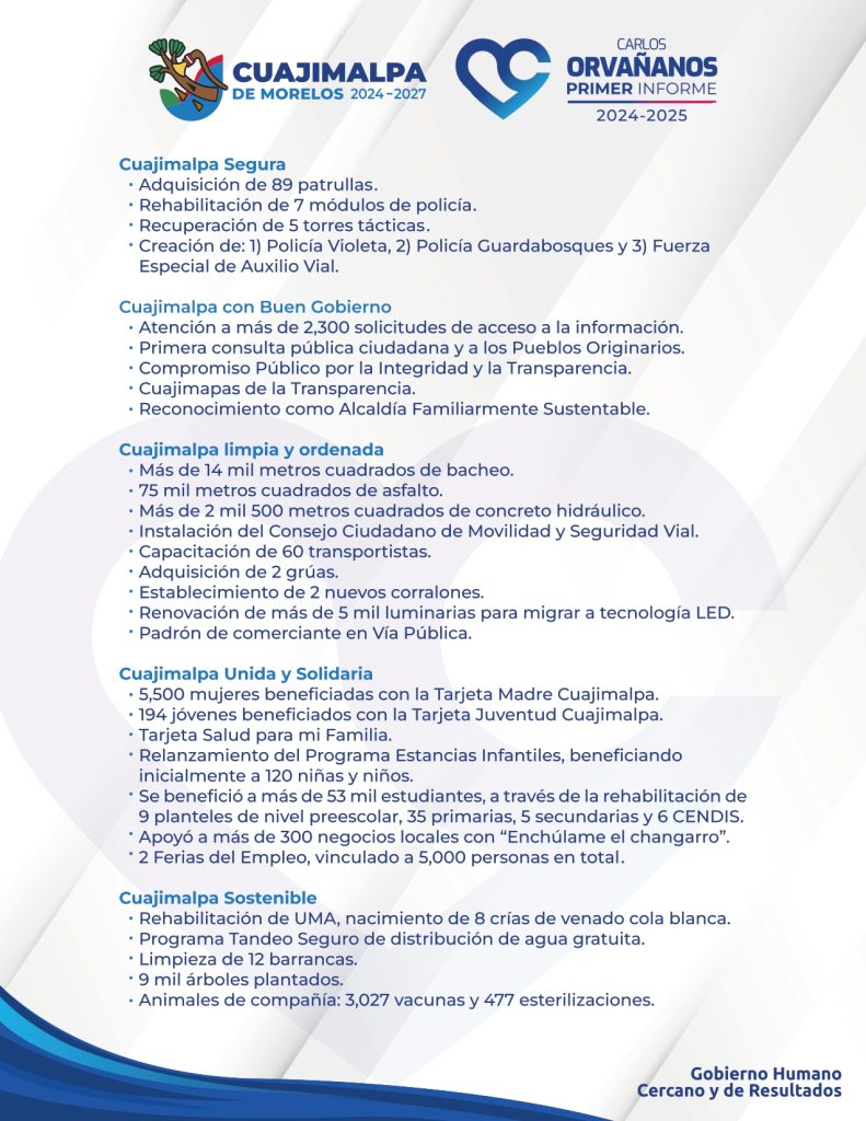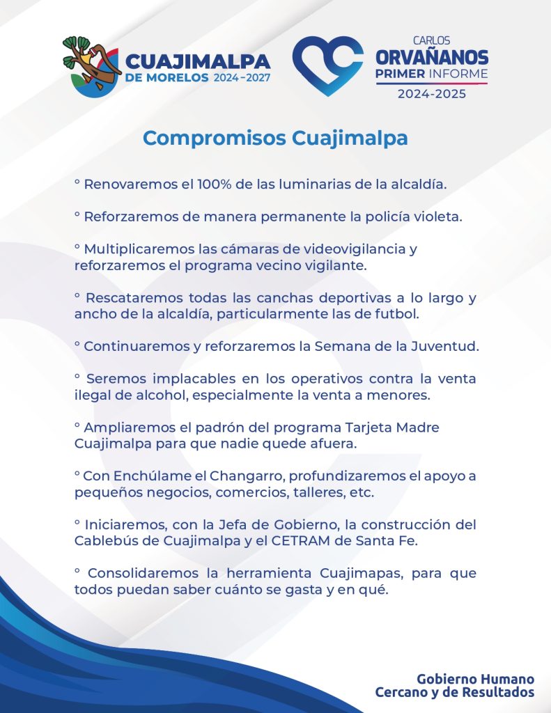 Al presentar su Primer Informe de Gobierno, el alcalde de Cuajimalpa, Carlos Orvañanos Rea destacó más de 50 logros alcanzados refrendó los compromisos para lo que resta de su administración.